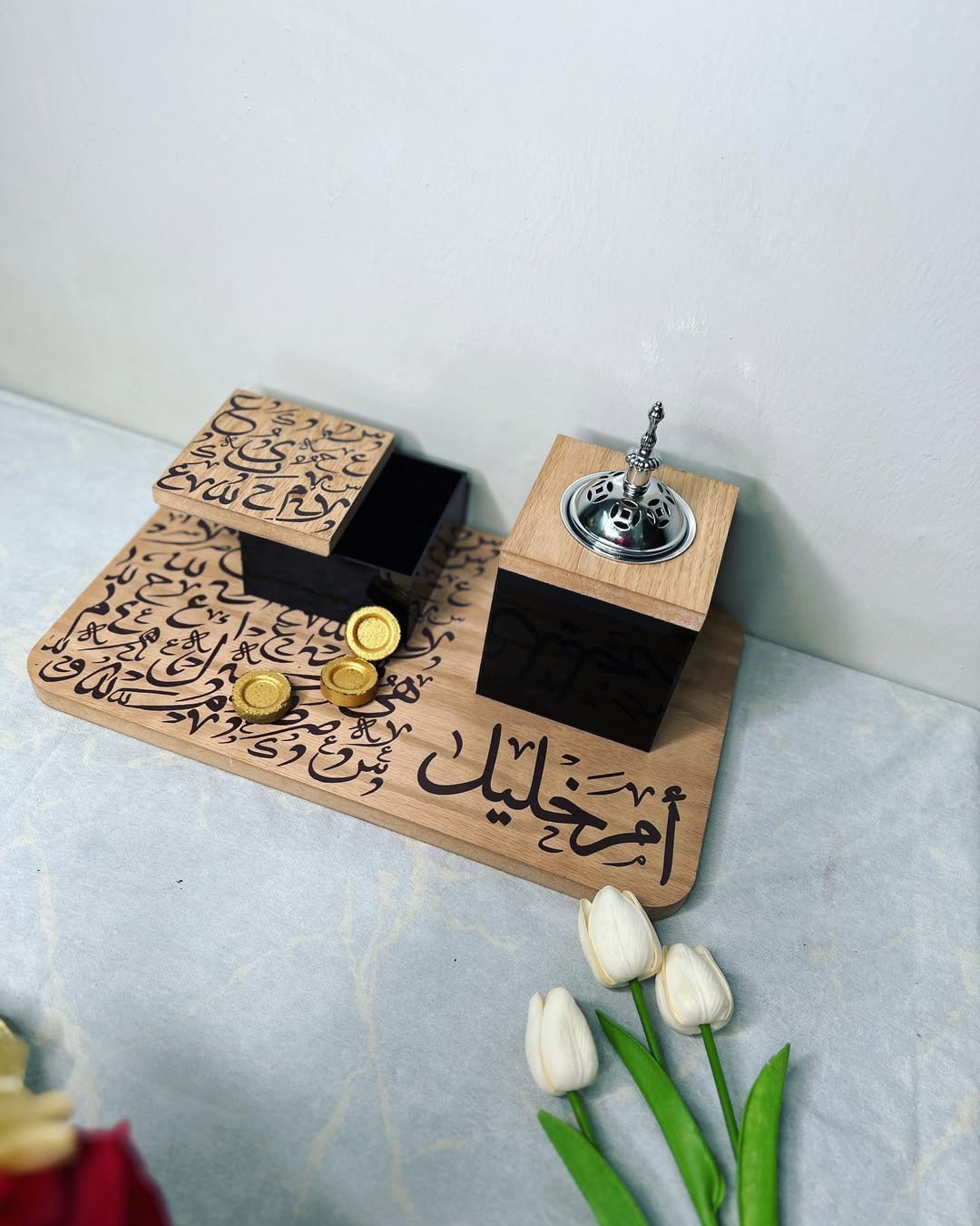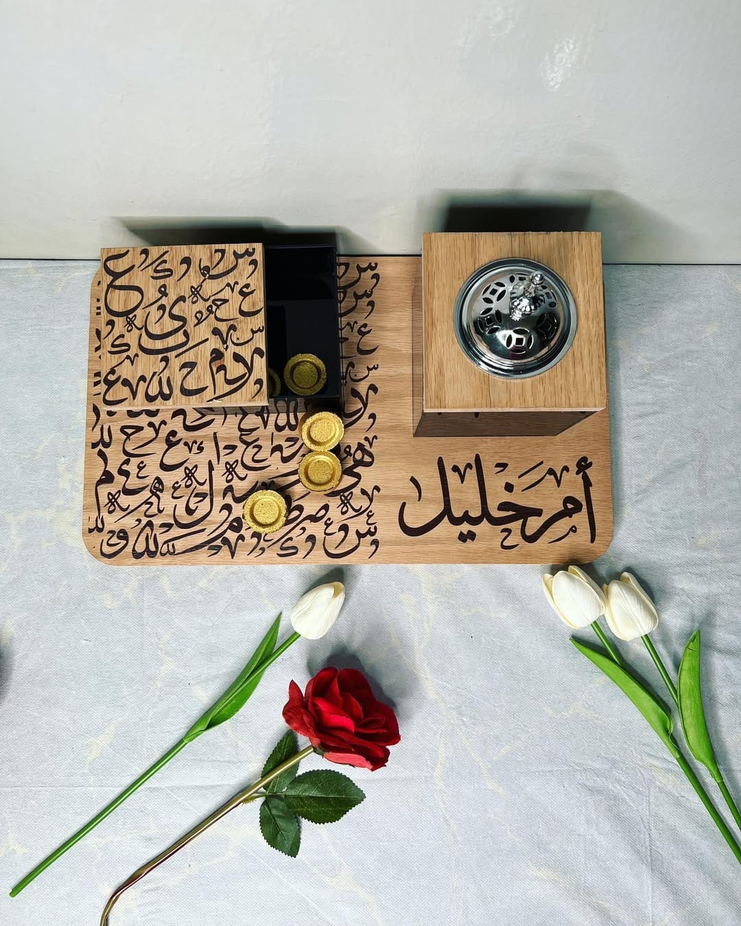 قطعة تجمع بين الفن العربي الأصيل والتصميم العصري، مصنوعة من الخشب الطبيعي المحفور بزخارف الخط العربي، وتتكوّن من مبخرة + علبة لحفظ الفحم، وتُثبت جميعها على قاعدة أنيقة مزخرفة.