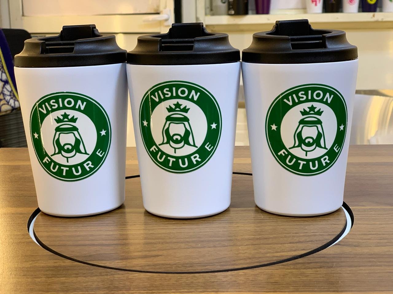 كوب ابيض الرؤية إصدار MBS Vision يأتي بتصميم دائري أنيق مستوحى من روح القائد ورؤية المستقبل، مع لمسة عصرية مستلهمة من أسلوب الدوائر الشهير في العلامات العالمية. يتميز برسومات أيقونية تعبّر عن الطموح والقوة، ليكون كوب ابيض يلفت الأنظار ويعكس ذوقًا راقيًا في كل استخدام احصل عليها الان من متجر لمسات-lamsat .